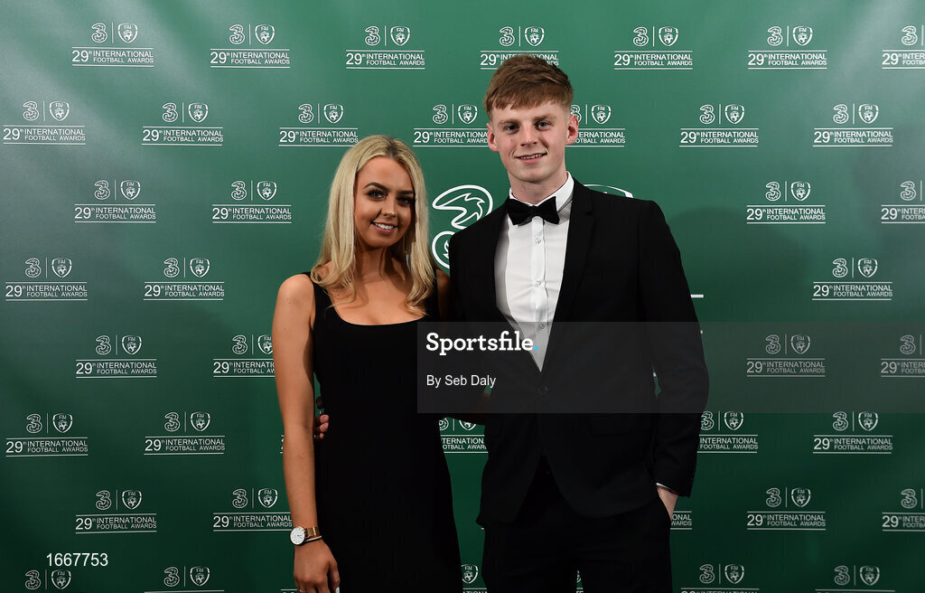 17 March 2019; Rob Slevin of University College Cork and Caryn Moriarty prior to the Three FAI International Awards at RTE Studios in Donnybrook, Dublin. Photo by Seb Daly/Sportsfile