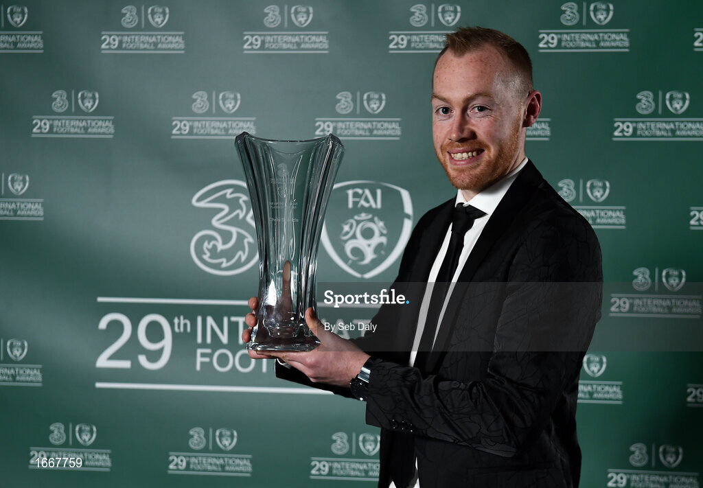 17 March 2019; SSE Airtricity League Player of the Year Chris Shields of Dundalk with his award during the Three FAI International Awards at RTE Studios in Donnybrook, Dublin. Photo by Seb Daly/Sportsfile