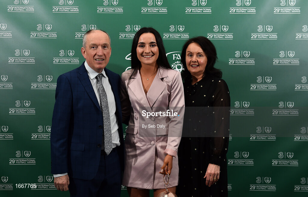 17 March 2019; Niamh Farrelly of Republic of Ireland and Peamount United, with Matthew Farrelly and Geraldine Boyle prior to the Three FAI International Awards at RTE Studios in Donnybrook, Dublin. Photo by Seb Daly/Sportsfile