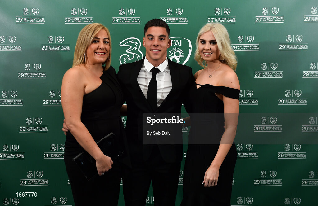 17 March 2019; Reece Grego-Cox of Republic of Ireland Under 21 with Gina Grego-Cox and Megan Edwards prior to the Three FAI International Awards at RTE Studios in Donnybrook, Dublin. Photo by Seb Daly/Sportsfile