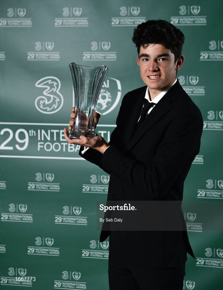 17 March 2019; Under 15 International Player of the Year Anselmo Garcia MacNulty with his award during the Three FAI International Awards at RTE Studios in Donnybrook, Dublin. Photo by Seb Daly/Sportsfile