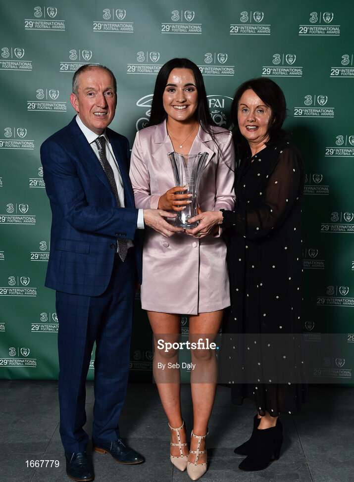 17 March 2019; Under 19 Women's International Player of the Year Niamh Farrelly Matthew Farrelly and Geraldine Boyle following the Three FAI International Awards at RTE Studios in Donnybrook, Dublin. Photo by Seb Daly/Sportsfile