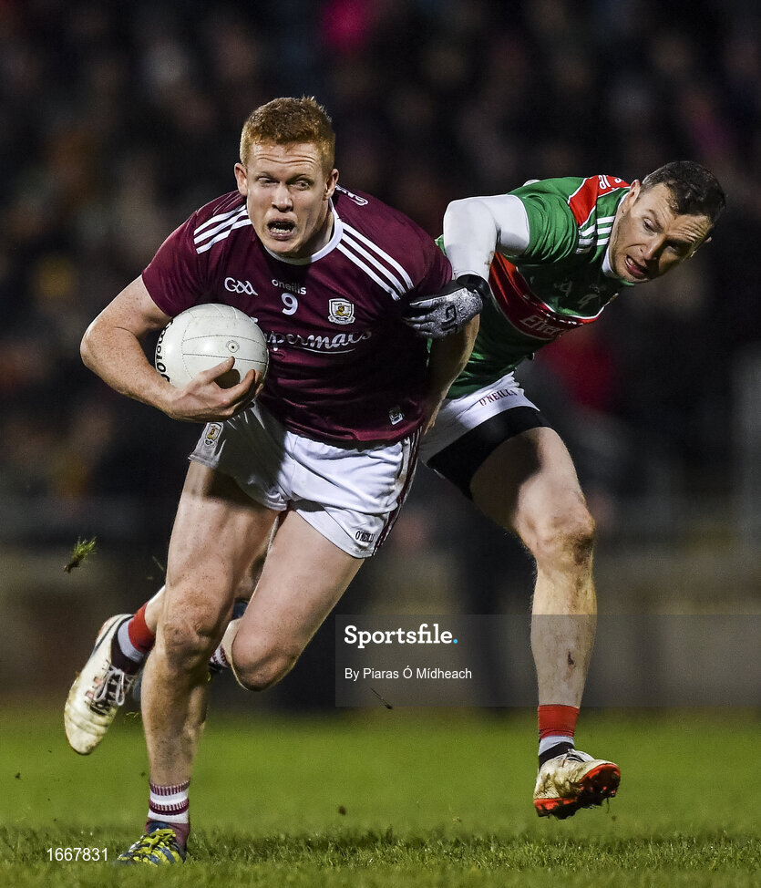 2 March 2019; Ciarán Duggan of Galway in action against Keith Higgins of Mayo during the Allianz Football League Division 1 Round 5 match between Mayo and Galway at Elverys MacHale Park in Castlebar, Mayo. Photo by Piaras Ó Mídheach/Sportsfile