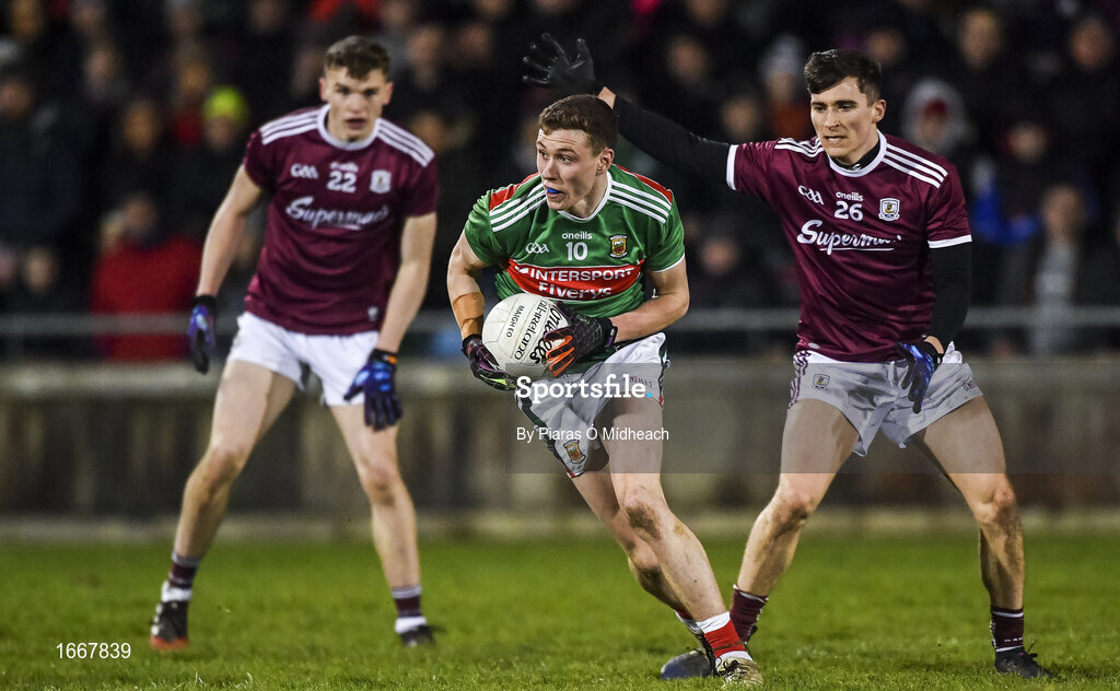 2 March 2019; Fionn McDonagh of Mayo in action against John Daly, left, and Finnian Ó Laoí during the Allianz Football League Division 1 Round 5 match between Mayo and Galway at Elverys MacHale Park in Castlebar, Mayo. Photo by Piaras Ó Mídheach/Sportsfile
