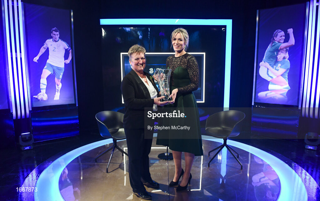 17 March 2019; Former Republic of Ireland women's goalkeeper Emma Byrne receives the Hall of Fame Award from Chairperson of the Women's Football Committee Niamh O'Donoghue during the Three FAI International Awards at RTE Studios in Donnybrook, Dublin. Photo by Stephen McCarthy/Sportsfile