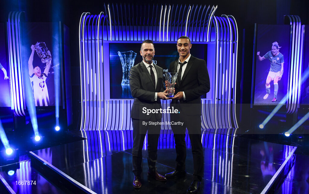 17 March 2019; Adam Idah receives the Men's U17 International Player of the Year award from Alan Peyton of Three during the Three FAI International Awards at RTE Studios in Donnybrook, Dublin. Photo by Stephen McCarthy/Sportsfile
