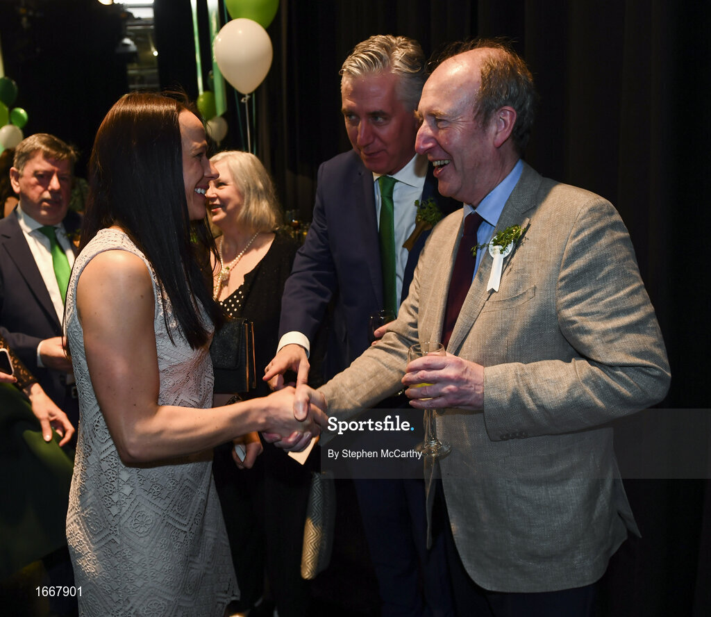 17 March 2019; Former Republic of Ireland international Áine O'Gorman with Minister for Transport, Tourism and Sport, Shane Ross T.D. and John Delaney, CEO, Football Association of Ireland, during the Three FAI International Awards at RTE Studios in Donnybrook, Dublin. Photo by Stephen McCarthy/Sportsfile