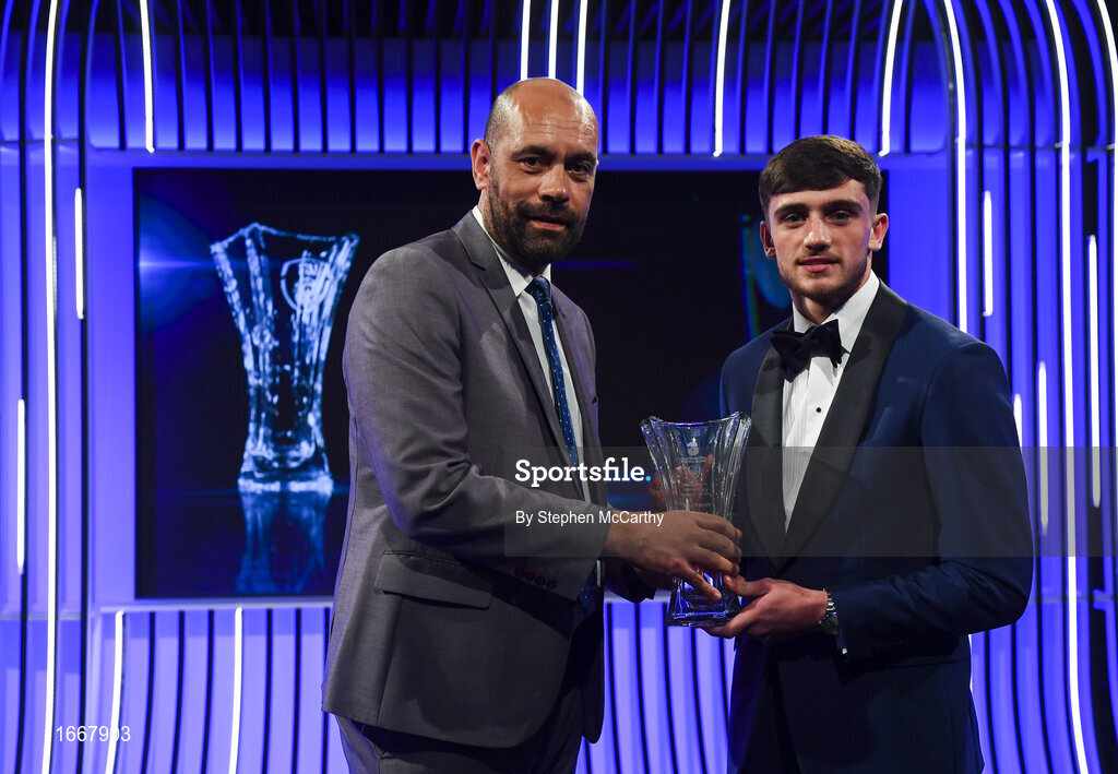 17 March 2019; Troy Parrott receives the Men's U16 International Player of the Year award from Republic of Ireland U16 manager Paul Osam during the Three FAI International Awards at RTE Studios in Donnybrook, Dublin. Photo by Stephen McCarthy/Sportsfile