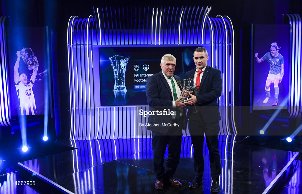 17 March 2019; Eoin Hayes of Newmarket Celtic receives the Junior International Player of the Year award from FAI Vice President Noel Fitzroy during the Three FAI International Awards at RTE Studios in Donnybrook, Dublin. Photo by Stephen McCarthy/Sportsfile