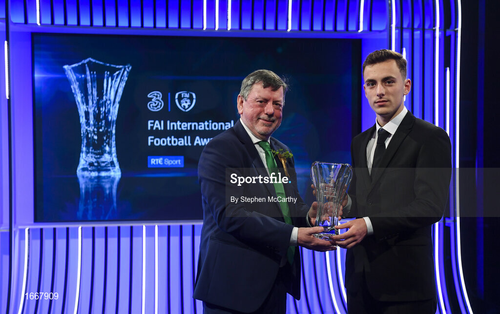 17 March 2019; Lee O'Connor receives the Men's U19 International Player of the Year award from FAI President Donal Conway during the Three FAI International Awards at RTE Studios in Donnybrook, Dublin. Photo by Stephen McCarthy/Sportsfile