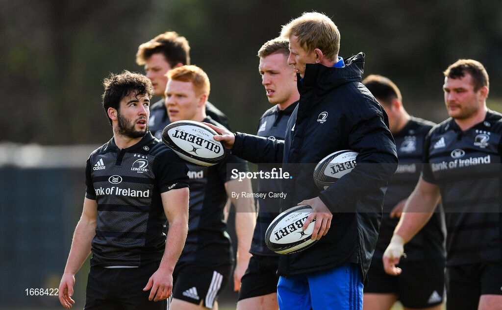 18 March 2019; Head coach Leo Cullen in conversation with Paddy Patterson during Leinster Rugby squad training at Rosemount in UCD, Dublin. Photo by Ramsey Cardy/Sportsfile