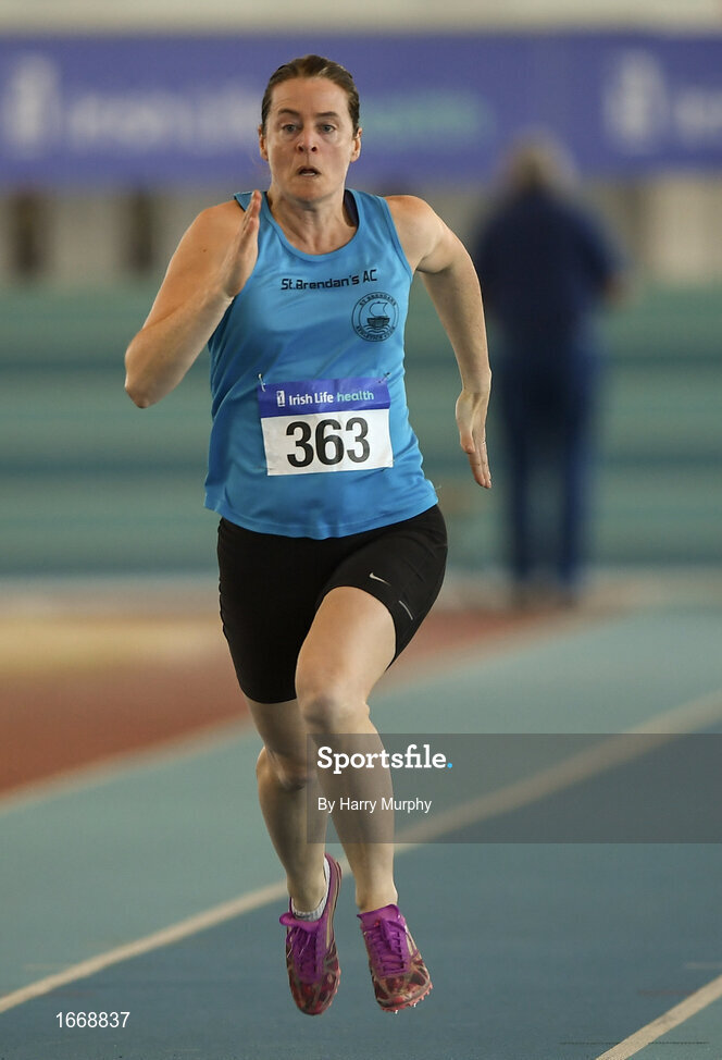 10 March 2019; Ursula Barrett of St. Brendan's A.C. (Kerry) competing in the 60m during the Irish Life Health Masters Indoors Championships at AIT in Athlone, Co Westmeath. Photo by Harry Murphy/Sportsfile