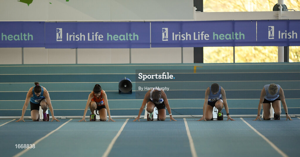 10 March 2019; A general view of the field at the start of the 60m during the Irish Life Health Masters Indoors Championships at AIT in Athlone, Co Westmeath. Photo by Harry Murphy/Sportsfile