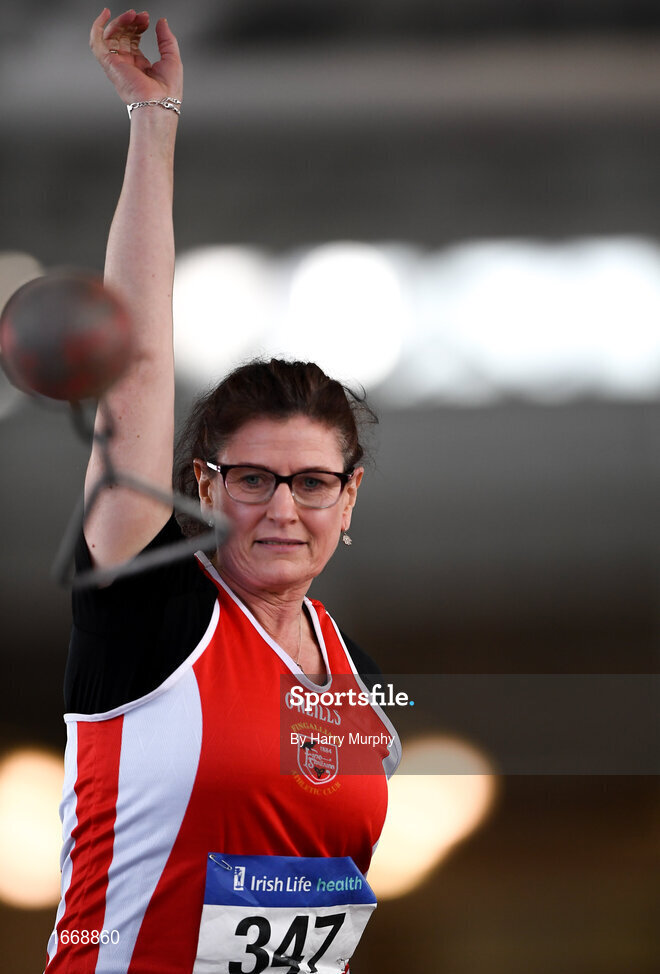 10 March 2019; Angela Torsney of Fingallians A.C. competing in the Weight for Distance 20lbs during the Irish Life Health Masters Indoors Championships at AIT in Athlone, Co Westmeath. Photo by Harry Murphy/Sportsfile