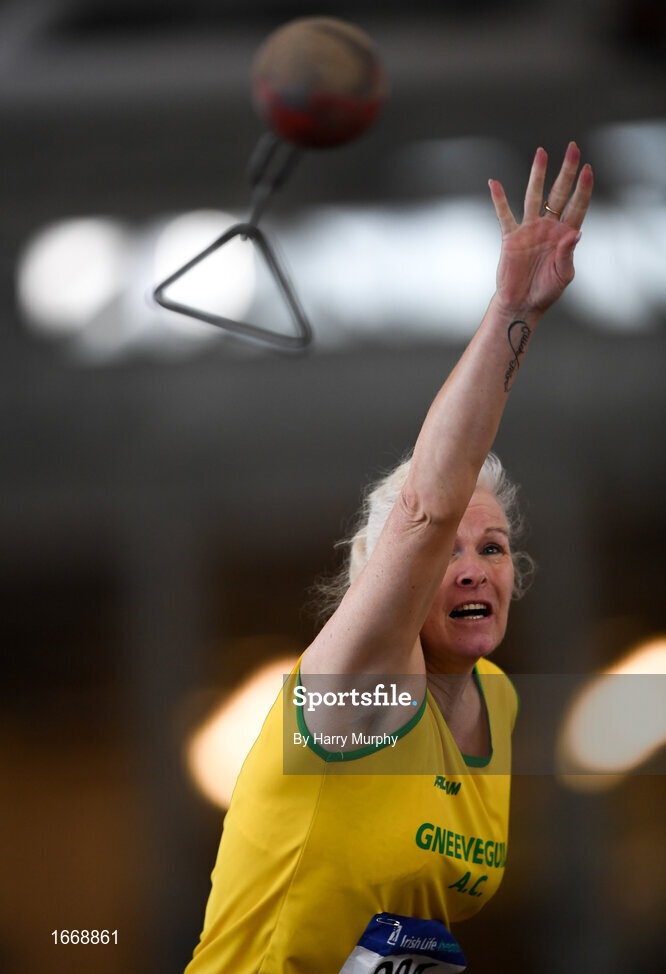 10 March 2019; Sheila ODonoghue of Gneeveguilla A.C. competing in the Weight for Distance 20lbs during the Irish Life Health Masters Indoors Championships at AIT in Athlone, Co Westmeath. Photo by Harry Murphy/Sportsfile