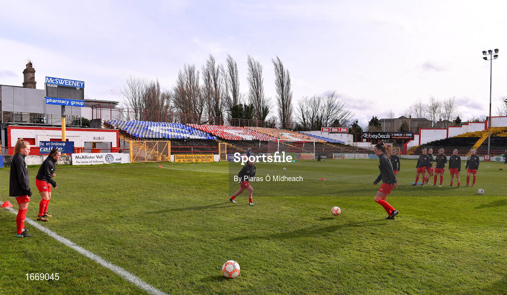 16 March 2019; Shelbourne players during the warm-up before the Só Hotels Women's National League match between Shelbourne and Limerick at Tolka Park in Dublin. Photo by Piaras Ó Mídheach/Sportsfile