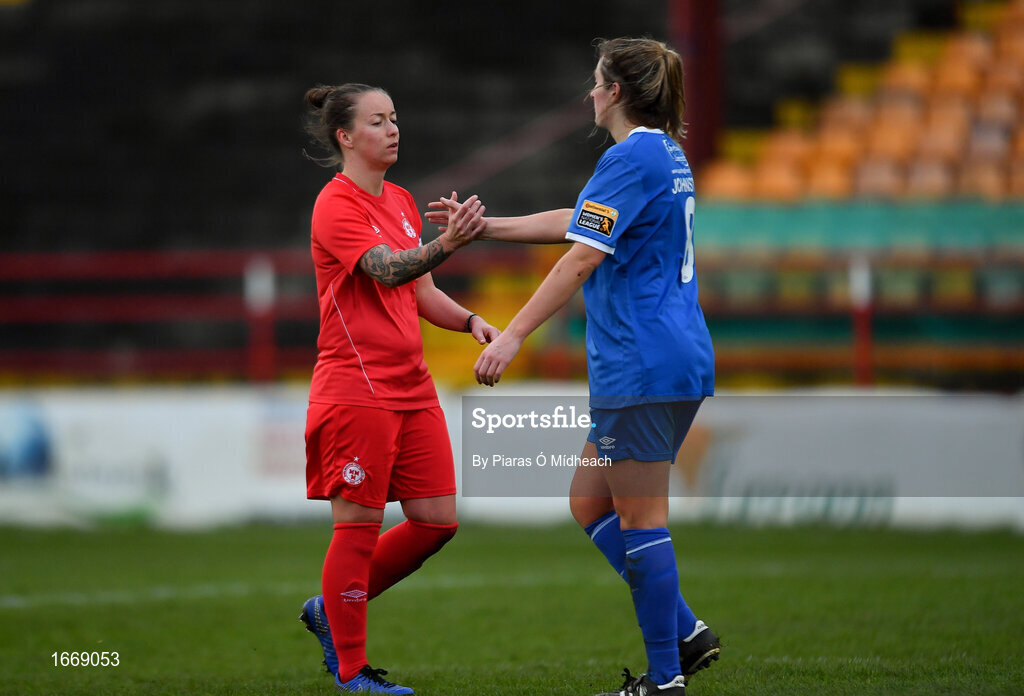 16 March 2019; Pearl Slattery of Shelbourne and Carys Johnson of Limerick shake hands after the Só Hotels Women's National League match between Shelbourne and Limerick at Tolka Park in Dublin. Photo by Piaras Ó Mídheach/Sportsfile
