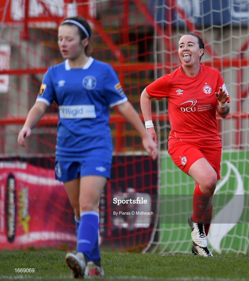 16 March 2019; Rebecca Creagh of Shelbourne celebrates scoring her side's third goal during the Só Hotels Women's National League match between Shelbourne and Limerick at Tolka Park in Dublin. Photo by Piaras Ó Mídheach/Sportsfile