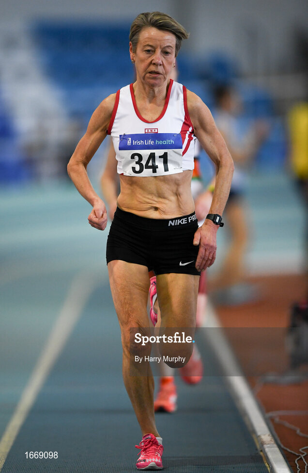 10 March 2019; Ann Sullivan of D.M.P. A.C. competing in the 3000m during the Irish Life Health Masters Indoors Championships at AIT in Athlone, Co Westmeath. Photo by Harry Murphy/Sportsfile