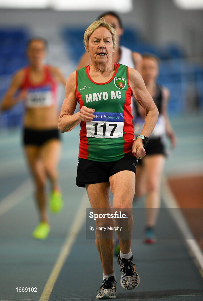 10 March 2019; Margaret Glavey of Mayo A.C. competing in the 1500m during the Irish Life Health Masters Indoors Championships at AIT in Athlone, Co Westmeath. Photo by Harry Murphy/Sportsfile