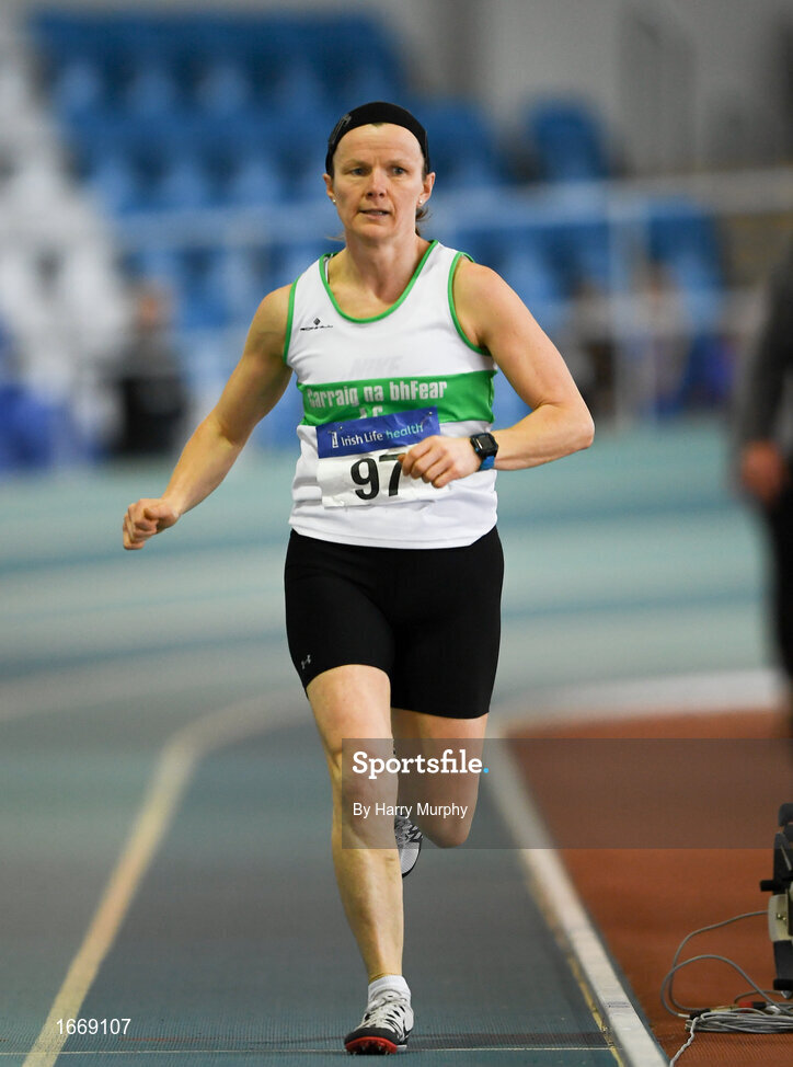 10 March 2019; Mary Fitzgerald of Carraig-Na-Bhfear A.C. competing in the 3000m during the Irish Life Health Masters Indoors Championships at AIT in Athlone, Co Westmeath. Photo by Harry Murphy/Sportsfile