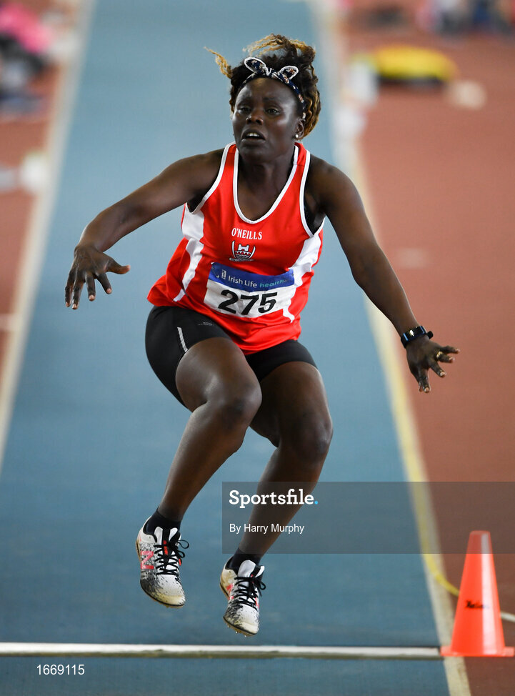 10 March 2019; Margaret OConnor of Enniscorthy A.C. competing in the Long Jump during the Irish Life Health Masters Indoors Championships at AIT in Athlone, Co Westmeath. Photo by Harry Murphy/Sportsfile