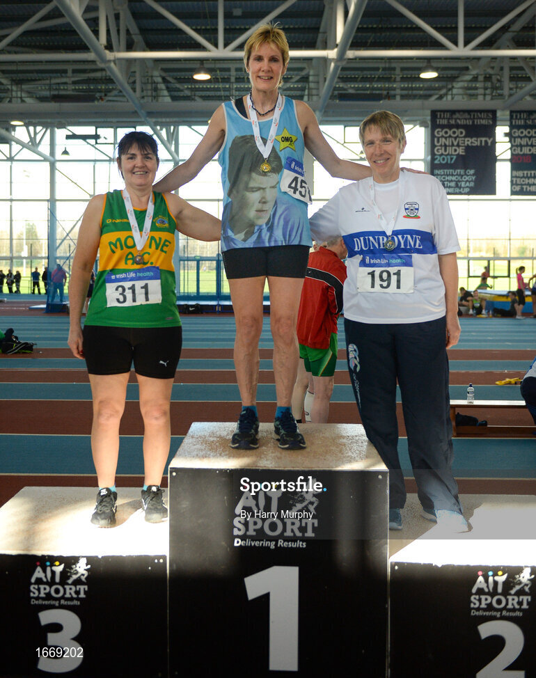 10 March 2019; Tina Gallagher of OMG A.C., first, Helen Lonergan of Dunboyne A.C., second, and Liz Power of Moyne A.C., third, after competing in the 60m during the Irish Life Health Masters Indoors Championships at AIT in Athlone, Co Westmeath. Photo by Harry Murphy/Sportsfile