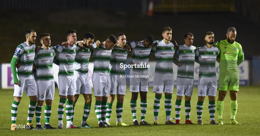 22 March 2019; Shamrock Rovers players stand for a minute's silence before the SSE Airtricity League Premier Division between Finn Harps and Shamrock Rovers at Finn Park in Ballybofey, Co. Donegal. Photo by Oliver McVeigh/Sportsfile