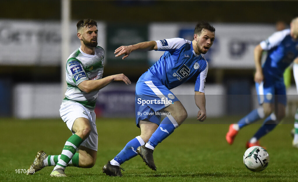 22 March 2019; Mark Coyle of Finn Harps in action against Greg Bolger of Shamrock Rovers during the SSE Airtricity League Premier Division between Finn Harps and Shamrock Rovers at Finn Park in Ballybofey, Co. Donegal. Photo by Oliver McVeigh/Sportsfile