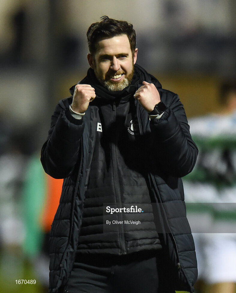 22 March 2019; Shamrock Rovers manager Stephen Bradley celebrates after the SSE Airtricity League Premier Division between Finn Harps and Shamrock Rovers at Finn Park in Ballybofey, Co. Donegal. Photo by Oliver McVeigh/Sportsfile