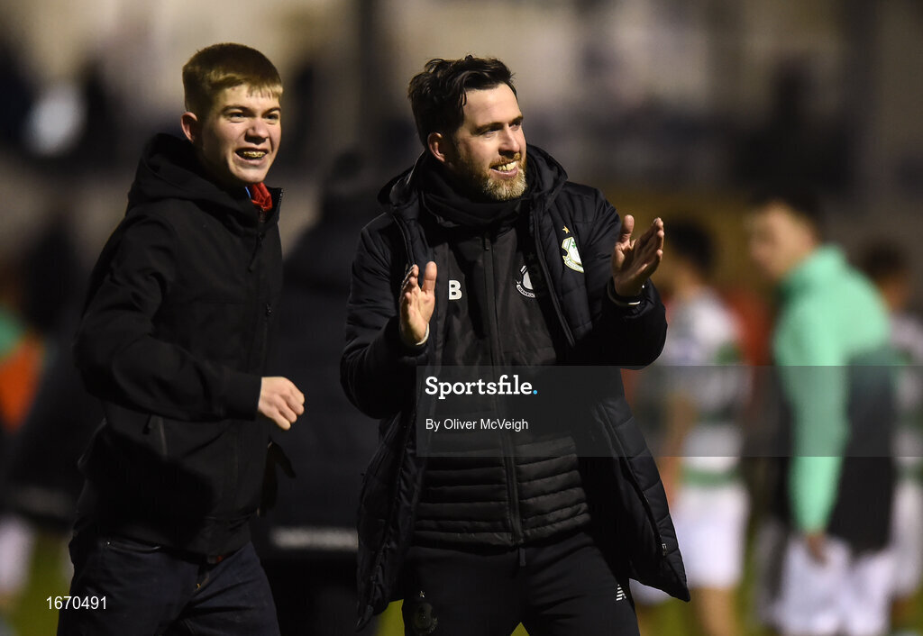22 March 2019; Shamrock Rovers manager Stephen Bradley celebrates after the SSE Airtricity League Premier Division between Finn Harps and Shamrock Rovers at Finn Park in Ballybofey, Co. Donegal. Photo by Oliver McVeigh/Sportsfile