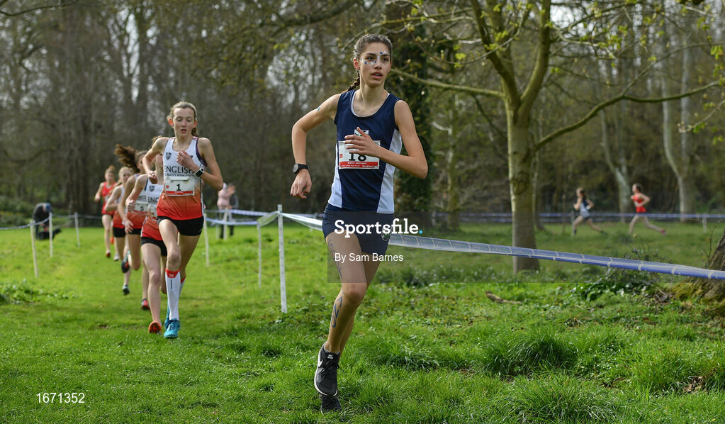 23 March 2019; Katie Johnson of Preston Lodge High School, Prestonpans, Scotland, competing in the Junior Girls event during the SIAB Schools Cross Country International at Santry Demense in Santry, Dublin. Photo by Sam Barnes/Sportsfile