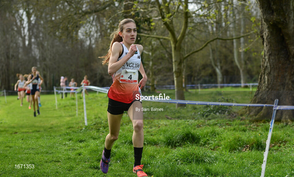 23 March 2019; Holly Weedall of Weaverham High School, Cheshire, England, on her way to winning the Junior Girls event during the SIAB Schools Cross Country International at Santry Demense in Santry, Dublin. Photo by Sam Barnes/Sportsfile