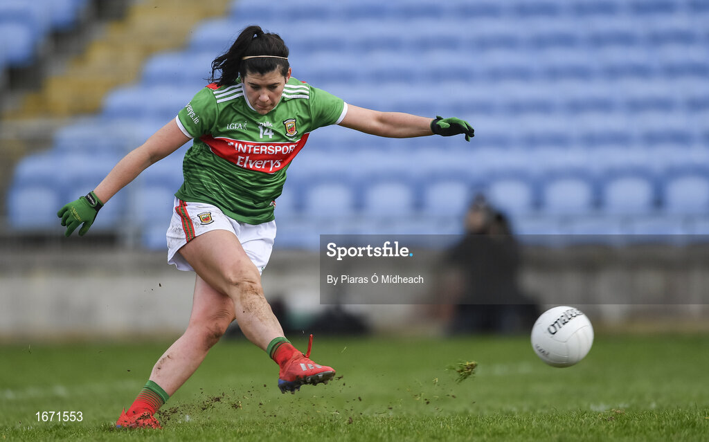 24 March 2019; Rachel Kearns of Mayo takes a first half penalty that was saved by Cork goalkeeper Martina O’Brien during the Lidl Ladies NFL Round 6 match between Mayo and Cork at Elverys MacHale Park in Castlebar, Mayo. Photo by Piaras Ó Mídheach/Sportsfile