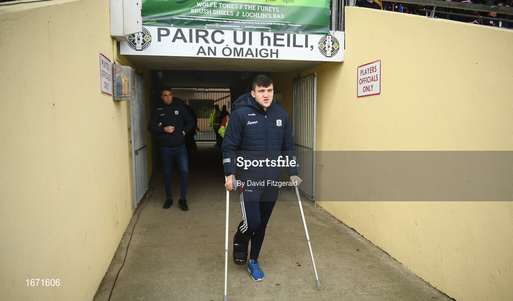 24 March 2019; Injured Galway player Damien Comer prior to the Allianz Football League Division 1 Round 7 match between Tyrone and Galway at Healy Park in Omagh. Photo by David Fitzgerald/Sportsfile