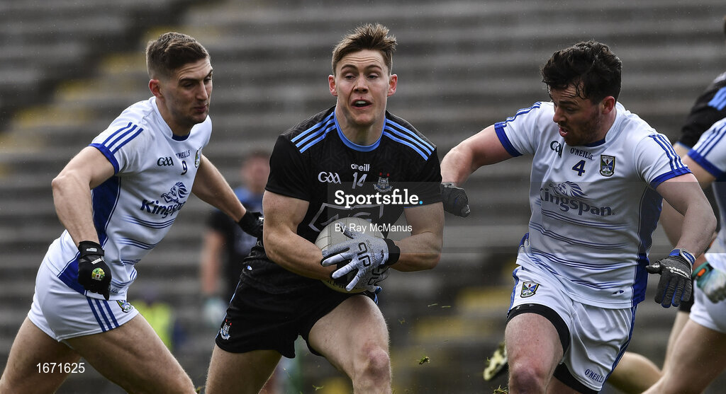 24 March 2019; Con O’Callaghan of Dublin in action against Killian Clarke and Conor Moynagh of Cavan during the Allianz Football League Division 1 Round 7 match between Cavan and Dublin at Kingspan Breffni in Cavan. Photo by Ray McManus/Sportsfile