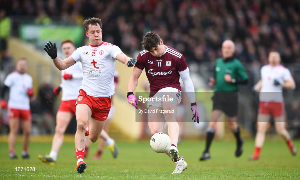 24 March 2019; Shane Walsh of Galway in action against Kieran McGeary of Tyrone during the Allianz Football League Division 1 Round 7 match between Tyrone and Galway at Healy Park in Omagh. Photo by David Fitzgerald/Sportsfile