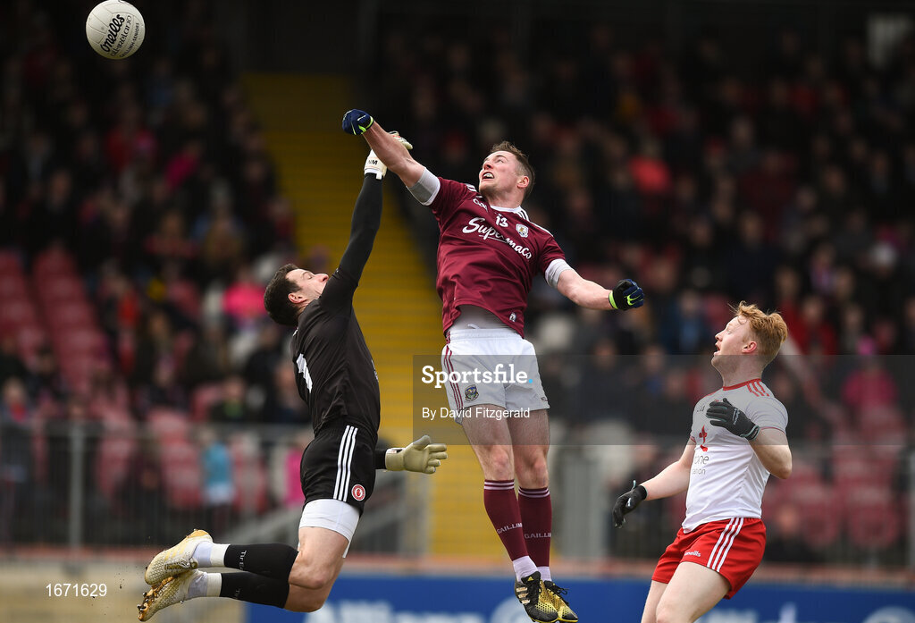 24 March 2019; Danny Cummins of Galway scores his side's first goal during the Allianz Football League Division 1 Round 7 match between Tyrone and Galway at Healy Park in Omagh. Photo by David Fitzgerald/Sportsfile