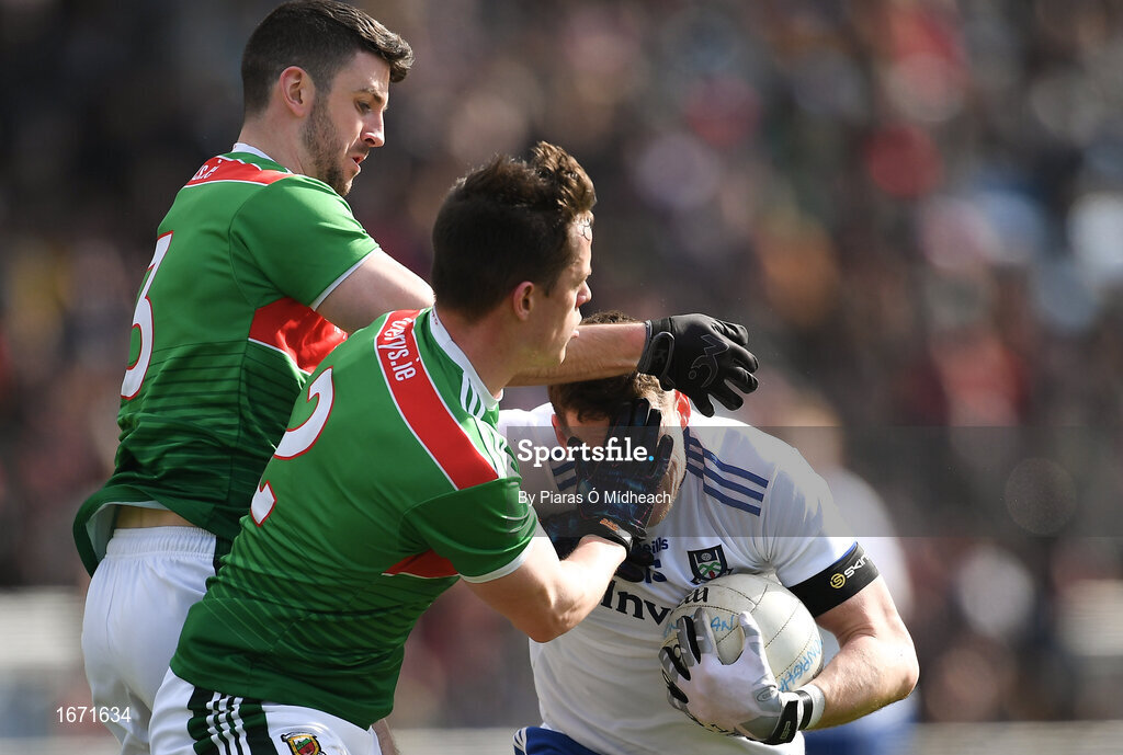 24 March 2019; Conor McManus of Monaghan in action against Brendan Harrison, left, and Stephen Coen of Mayo during the Allianz Football League Division 1 Round 7 match between Mayo and Monaghan at Elverys MacHale Park in Castlebar, Mayo. Photo by Piaras Ó Mídheach/Sportsfile