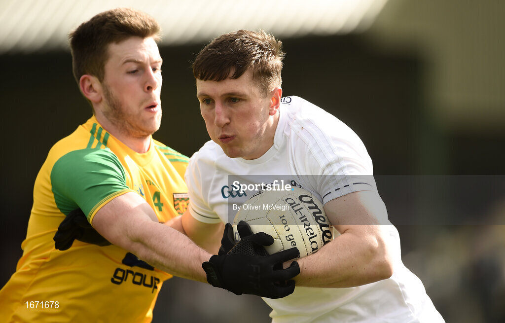 24 March 2019; Neil Flynn of Kildare, left, in action against Eoghan Ban Gallagher of Donegal during the Allianz Football League Division 2 Round 7 match between Donegal and Kildare at Fr. Tierney Park in Ballyshannon, Donegal. Photo by Oliver McVeigh/Sportsfile