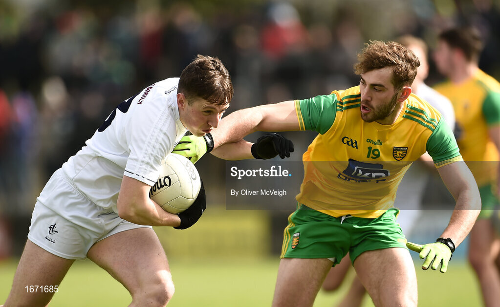 24 March 2019; Neil Flynn of Kildare in action against Stephen McMenamin of Donegal during the Allianz Football League Division 2 Round 7 match between Donegal and Kildare at Fr. Tierney Park in Ballyshannon, Donegal. Photo by Oliver McVeigh/Sportsfile