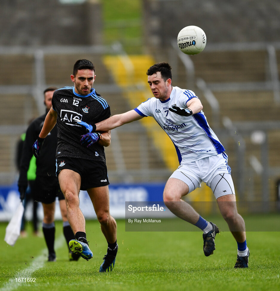 24 March 2019; Niall Scully of Dublin in action against Conor Rehill of Cavan during the Allianz Football League Division 1 Round 7 match between Cavan and Dublin at Kingspan Breffni in Cavan. Photo by Ray McManus/Sportsfile