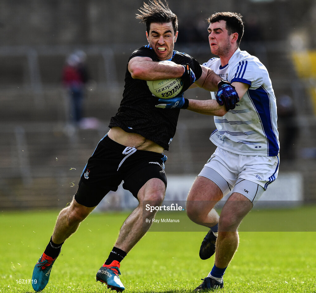24 March 2019; Michael Darragh MacAuley of Dublin in action against Conor Rehill of Cavan during the Allianz Football League Division 1 Round 7 match between Cavan and Dublin at Kingspan Breffni in Cavan. Photo by Ray McManus/Sportsfile