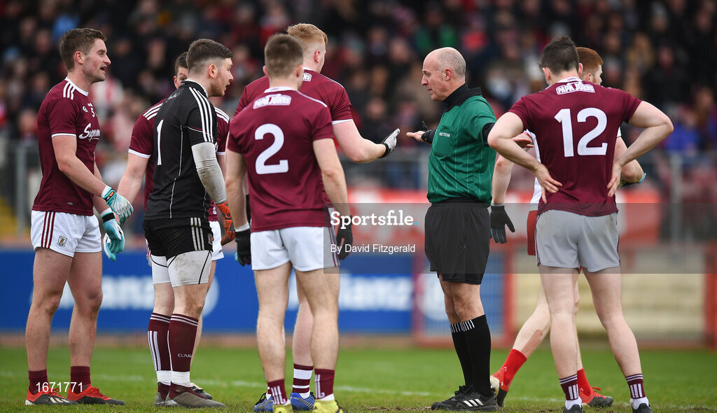 24 March 2019; Galway players remonstrate with referee Cormac Reilly after he awarded a penalty for Tyrone during the Allianz Football League Division 1 Round 7 match between Tyrone and Galway at Healy Park in Omagh. Photo by David Fitzgerald/Sportsfile
