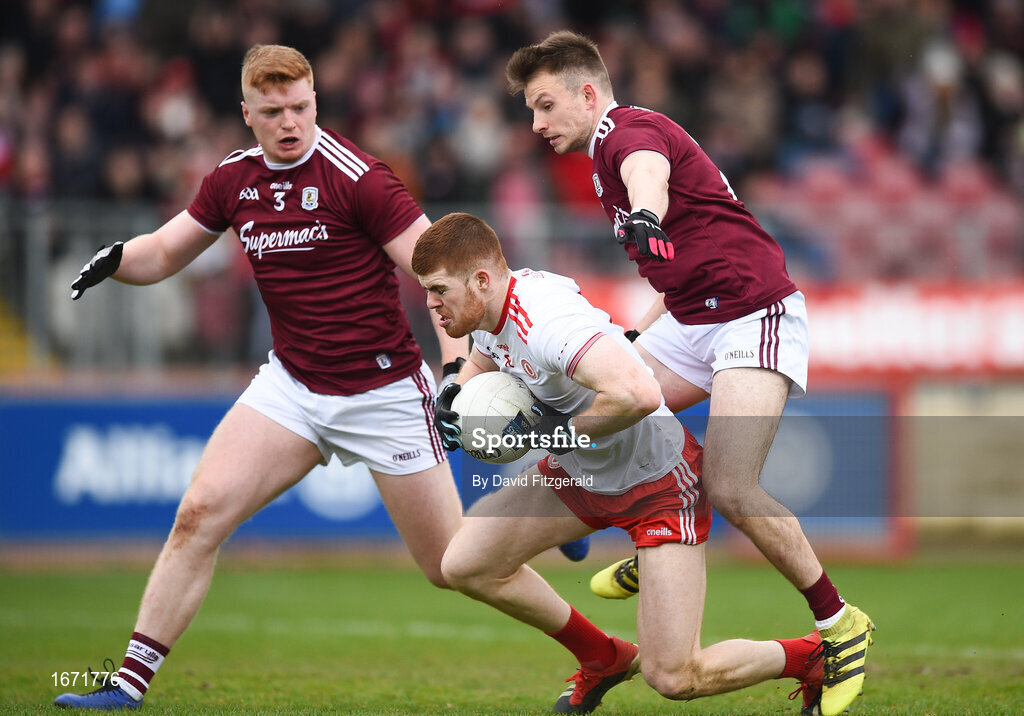 24 March 2019; Cathal McShane of Tyrone is tackled by Eoghan Kerin of Galway resulting in a penalty during the Allianz Football League Division 1 Round 7 match between Tyrone and Galway at Healy Park in Omagh. Photo by David Fitzgerald/Sportsfile