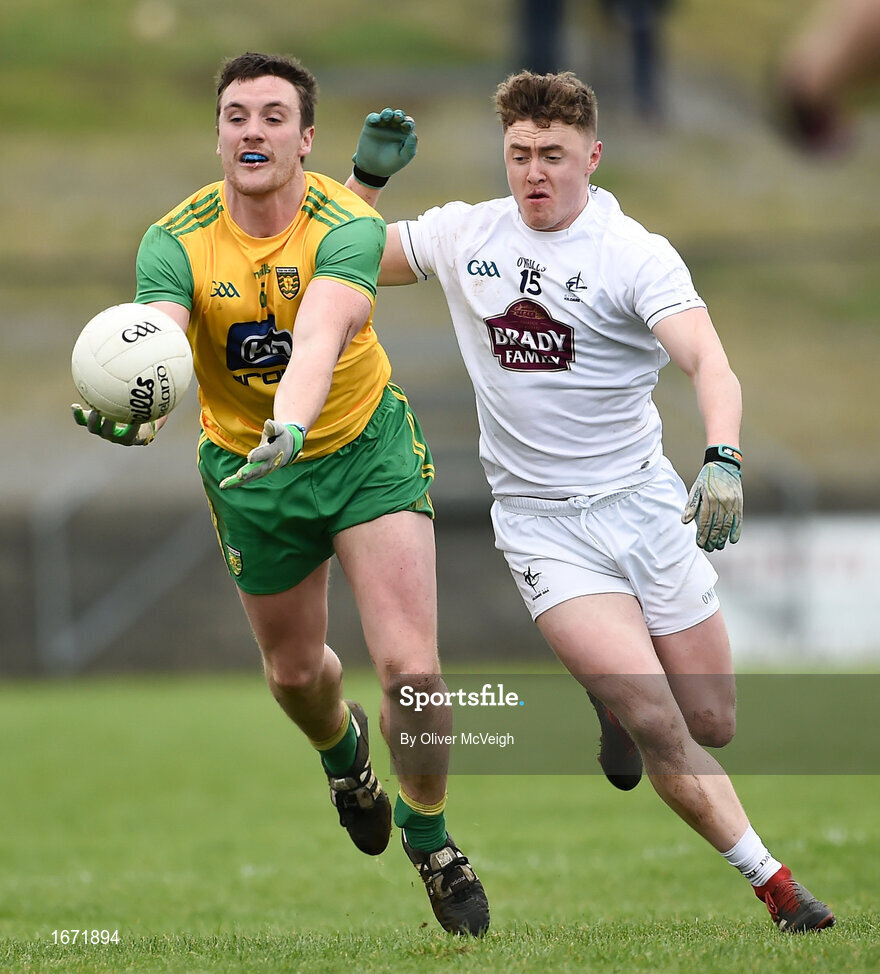 24 March 2019; Leo McLoone of Donegal in action against Jimmy Hyland of Kildare during the Allianz Football League Division 2 Round 7 match between Donegal and Kildare at Fr. Tierney Park in Ballyshannon, Donegal. Photo by Oliver McVeigh/Sportsfile