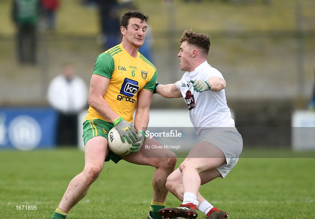 24 March 2019; Leo McLoone of Donegal in action against Jimmy Hyland of Kildare during the Allianz Football League Division 2 Round 7 match between Donegal and Kildare at Fr. Tierney Park in Ballyshannon, Donegal. Photo by Oliver McVeigh/Sportsfile