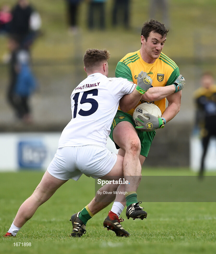 24 March 2019; Leo McLoone of Donegal in action against Jimmy Hyland of Kildare during the Allianz Football League Division 2 Round 7 match between Donegal and Kildare at Fr. Tierney Park in Ballyshannon, Donegal. Photo by Oliver McVeigh/Sportsfile