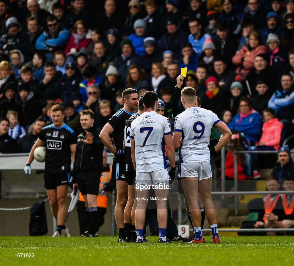 24 March 2019; Referee Rory Hickey issues yellow cards to James McCarthy and Niall Scully of Dublin and to Conor Rehill and Killian Clarke of Cavan during the Allianz Football League Division 1 Round 7 match between Cavan and Dublin at Kingspan Breffni in Cavan. Photo by Ray McManus/Sportsfile