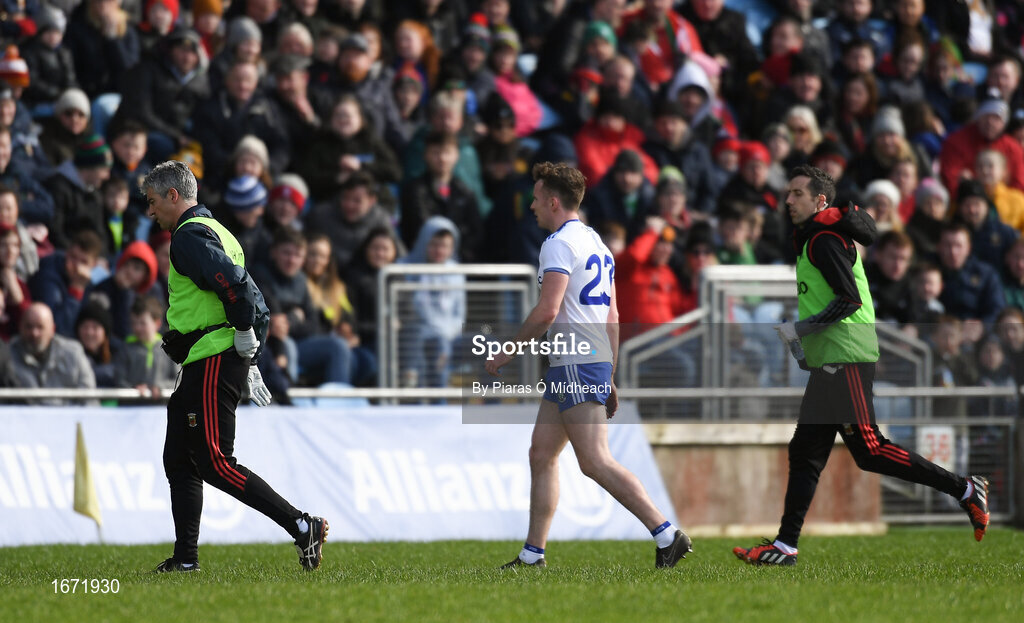 24 March 2019; Fintan Kelly of Monaghan leaves the field after being shown the red card by referee Derek O'Mahoney during the Allianz Football League Division 1 Round 7 match between Mayo and Monaghan at Elverys MacHale Park in Castlebar, Mayo. Photo by Piaras Ó Mídheach/Sportsfile
